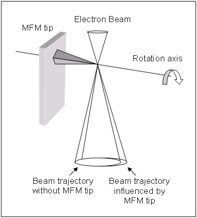 Lorentz electron tomography used by McVitie et al. [2603] registers the deflection of an accelerated electron beam influenced by the magnetic field in the nearest vicinity of the MFM tip (Fig. 2).